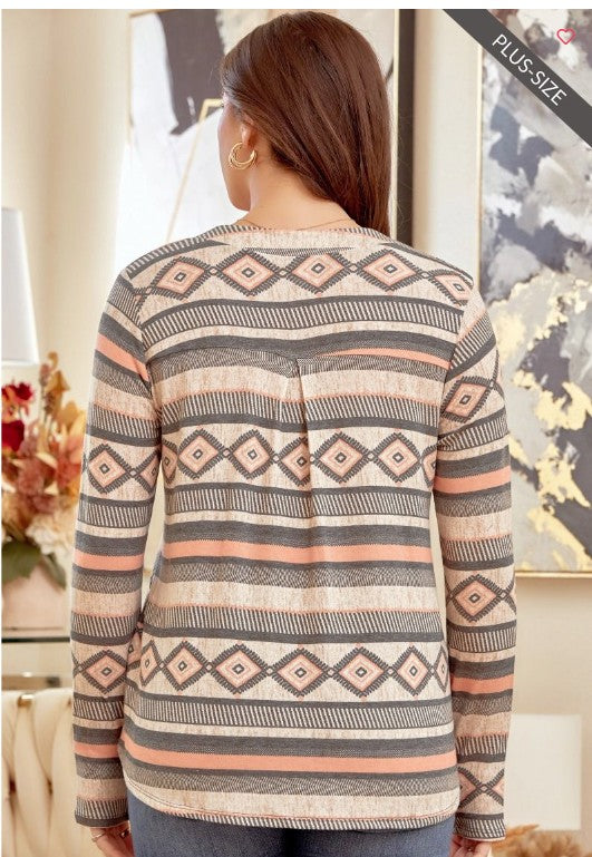 We love our lizzy aztec top in this knit material! China collar detail on the neckline with long sleeves. This top is a relaxed fit with stretchy fit. Non sheer, knit.